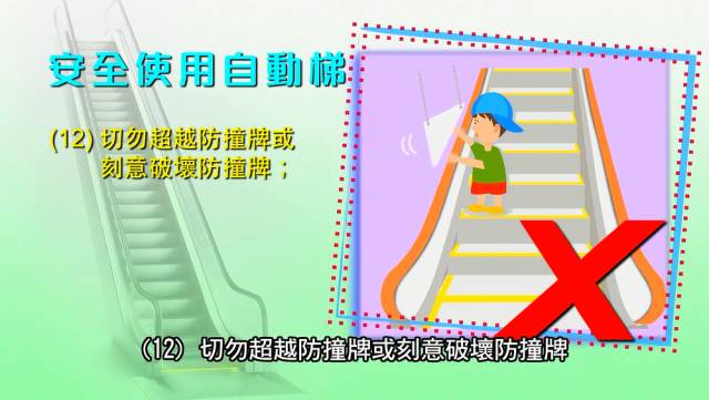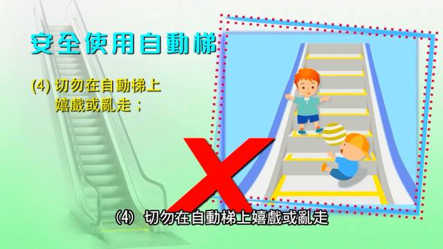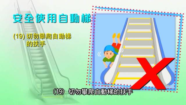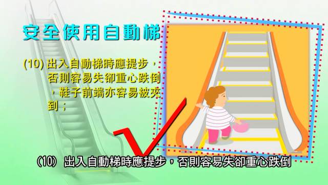 出入自動扶梯時應提步,否則容易失去重心跌倒,鞋子前端亦容易被夾到!