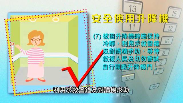 (一)保持鎮定,穩定情緒,不要自行向電梯外翻爬;
