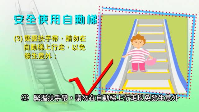 緊握扶手帶,請勿在自動扶梯上行走,以免發生意外!
