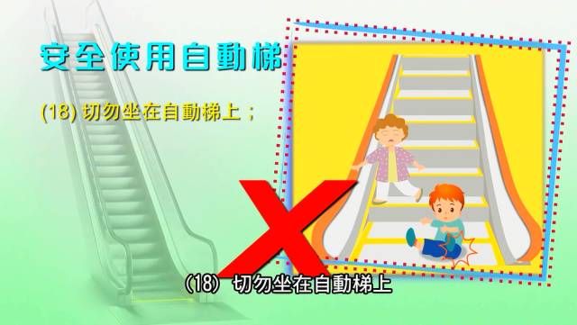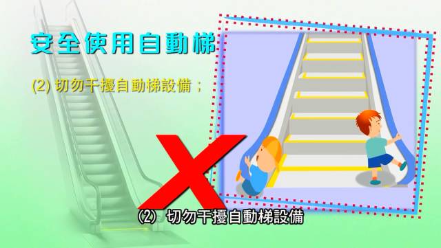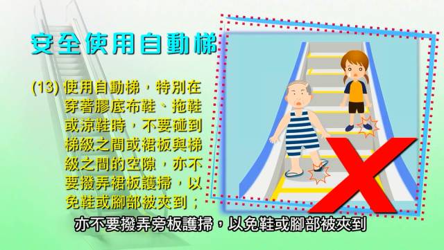 乘坐自動扶梯時,特別在穿著膠底布鞋、拖鞋或涼鞋時,不要碰到梯級之間或裙板與梯級之間的空隙,也不要撥弄裙板護掃,以免鞋或腳部被夾到!