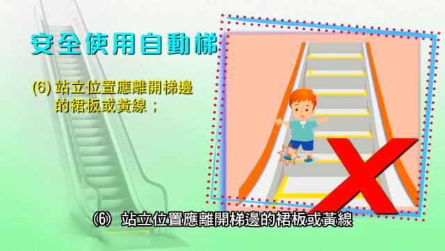 踏入自動扶梯時要注意雙腳離開梯級邊緣,站在梯級踏板黃色安全警示邊框內。勿踩在2個梯級的交界處,以免摔倒。