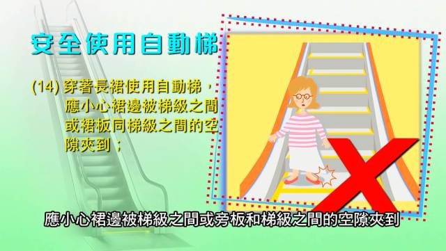 穿著長裙乘坐自動扶梯,應小心裙邊被梯級之間或裙板同梯級之間的空隙夾到!