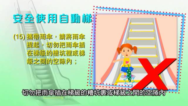 攜帶雨傘乘坐自動扶梯,請把雨傘提起,切勿把雨傘插在梯級的槽坑里或梯級之間的空隙內!